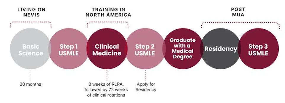 At MUA, our students are at the heart of everything we do. Our Doctor of Medicine (MD) program is designed to align with top U.S. and Canadian medical schools. It features five semesters of classroom and lab-based learning on our Nevis campus, followed by five semesters of clinical rotations at affiliated teaching hospitals, clinics and medical centers in the U.S., and select elective rotation sites in Canada.